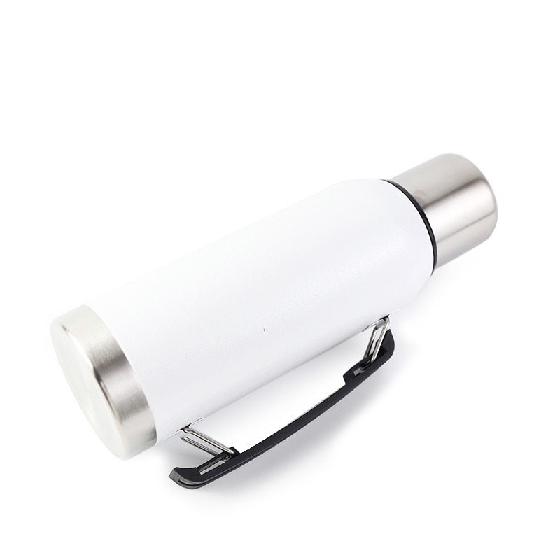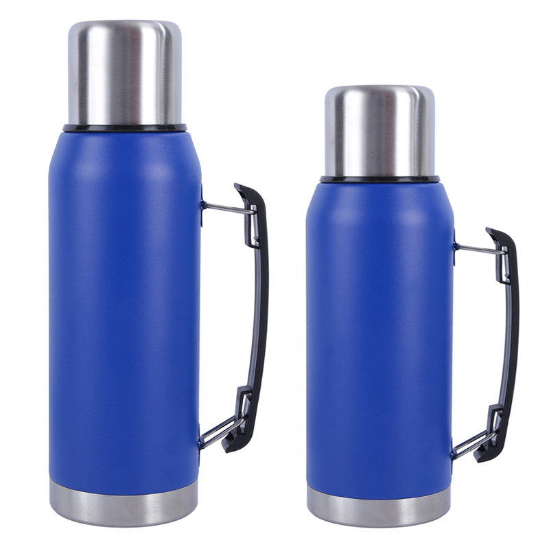यह छवि एक काले हैंडल के साथ एक नीली वैक्यूम फ्लास्क दिखाती है। हैंडल को एर्गोनोमिक रूप से डिज़ाइन किया गया है, जिससे यह पकड़ में आरामदायक हो जाता है। यह मेटल फास्टनरों के साथ फ्लास्क बॉडी से दृढ़ता से जुड़ा हुआ है, ले जाने के दौरान स्थायित्व और स्थिरता सुनिश्चित करता है।